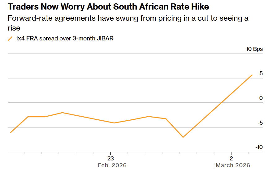 3. Stronger dollar, rising interest rates, precarious debt. Price increases on oil, food, and other products could help strengthen the US dollar and lead to weaker local currencies and rising inflation. That would put further pressure on developing countries’ trade balances and likely force governments to hike interest rates. That dynamic is already on display in South Africa, where traders spooked by the war in Iran quickly reversed expectations of an interest rate cut.